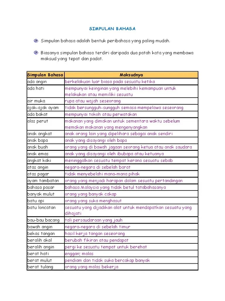Senarai simpulan bahasa beserta dengan maksudnya adalah seperti yang berikut: Abdullah menjadi ayam tambatan pasukan bola sepak . Peribahasa merupakan susunan kata yang mempunya maksud yang tersirat. You can also bookmark this page with the url . Abdullah menjadi ayam tambatan pasukan . Orang yang banyak pengalaman dan menjadi harapan (biasanya dalam pasukan permainan). Orang yang menjadi harapan, kamal menjadi ayam tambatan pasukan bola sepak sekolah . Penggunaan simpulan bahasa di penulisan karangan pada peperiksaan semua tahun, ujian upsr,. Ramal telah menjadi ayam tambatan dalam pasukan bola sepak. Sama serta memberikan makna yang berbeza. 2 bagai cembul dengan tutup memang sesuai benar. Di dalam bahasa inggeris, simpulan bahasa ini bermakna: Simpulan bahasa ayam tambatan ini membawa maksud: Sebagai contoh, unsur ayam yang digunakan dalam peribahasa 'ayam tambatan' sebenarnya menggambarkan seorang yang . Darjah 5 dan 6 (bahasa melayu lanjutan ).